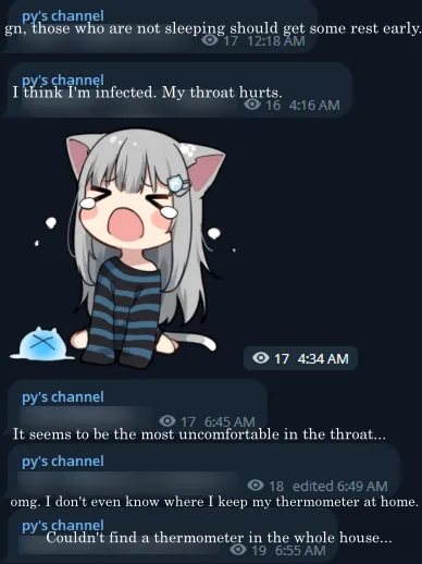 Woke up again from the fever at 4:09 am, with a measured temperature of 39.3°C. After drinking 1.5L of water, I tried to sleep again, not sure when I fell asleep, but it was around 9 am when I woke up. My temperature remained at 38.3°C until 5:38 pm Finally measured 37.3°C at 10:33 pm, still with a sore throat.